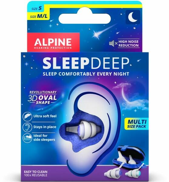 A füldugó egyedülálló ovális alakja követi a hallójárat formáját, így a füldugók nem esnek ki és nem okoznak kellemetlen érzést oldalt fekve sem. Ezenkívül a SleepDeep hangelnyelő gélt tartalmaz, mely hatékonyan csillapítja a környezeti zajokat és a horkolást. A SleepDeep füldugók általános csillapítása (SNR) 27 dB. Ez azt jelenti, hogy a legtöbb környezeti zajt csillapítja. Így egész éjjel nyugodtan alhatunk. A füldugók könnyen tisztán tarthatóak és kiváló minőségűek, így többször használhatóak. Fenntartható és higiénikus megoldás. Innovatív, hőre lágyuló anyagból készülnek, melyet az Alpine fejlesztett ki: ez az AlpineThermoShape. A füldugó felveszi a hallójárat formáját, így tökéletesen illeszkedik és a helyén is marad. Nem tartalmaz szilikont, nem okoz allergiás reakciót vagy viszketést. Használat: