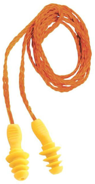 öntött, újrafelhasználható füldugó, három pengével, csatlakozószállal, újrazárható dobozban, hurokkal, anyag: poliuretán hab, szabvány: EN 352-2, SNR-csillapítás: 28 dB, szín: sárga-narancs